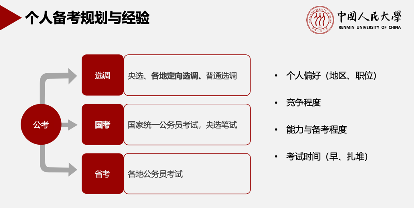 W师姐详细梳理了京选的整体情况,包括报名、资格审核、笔试、面试以及考察各个环节。同时对比介绍了公考与企业求职的差异,认为公考注重政治素养、知识储备和综合能力,求职则更看重专业技能、工作经验和沟通能力。
