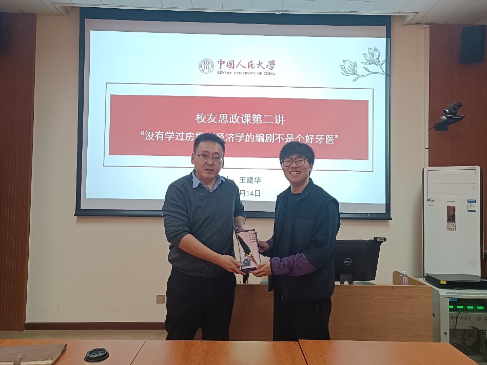 王建华校友从高考报考专业的选择、本科期间偶然加入人大戏剧社、硕士阶段坚定自己未来选择戏剧行业发展、初入戏剧行业为了生存与发展克服自己跨“专业”、跨“圈子”的瓶颈这四个方面为大家讲述自己职业发展的路径,最终通过他的不懈努力创造出一部部脍炙人口的优质作品。他用自己“酷”的经历、坚定的选择和深刻的感悟为公管学子们提供了宝贵的人生经验,也为广大青年提供了一份积极向上、勇于拼搏的人生指南。帮助师弟师妹们树立了正确的择业观、就业观,厘清职业生涯选择,提升其对未来就业前景和就业方向的认识,帮助其正确认识就业形势,尽快树立未来发展目标,做好职业发展规划,面向新未来。主题分享结束后,王建华校友还就同学们关心的在戏剧创造中如何平衡雅俗共赏关系等问题进行了回应。